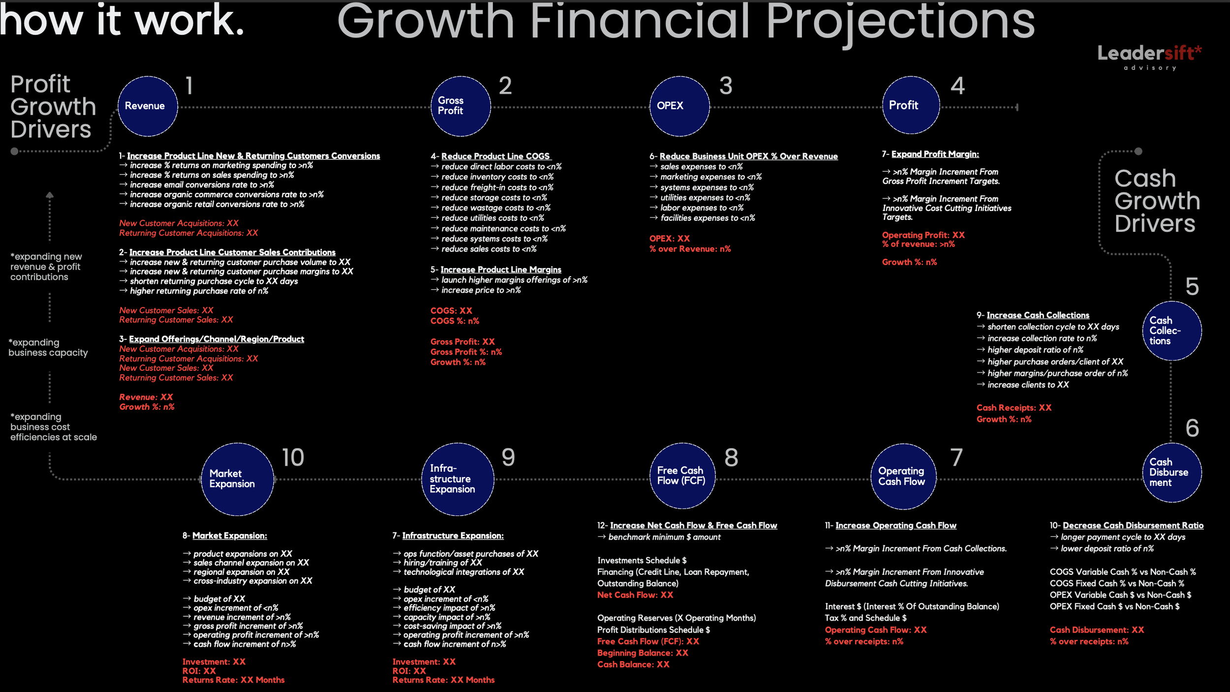 With quarterly growth structures to increase customer acquisitions, maximise customer sales margins, reduce-innovate cost structures, maximise profit margins & cash flow, and structures that efficiently expand infrastructures & revenue source to lead market categories.