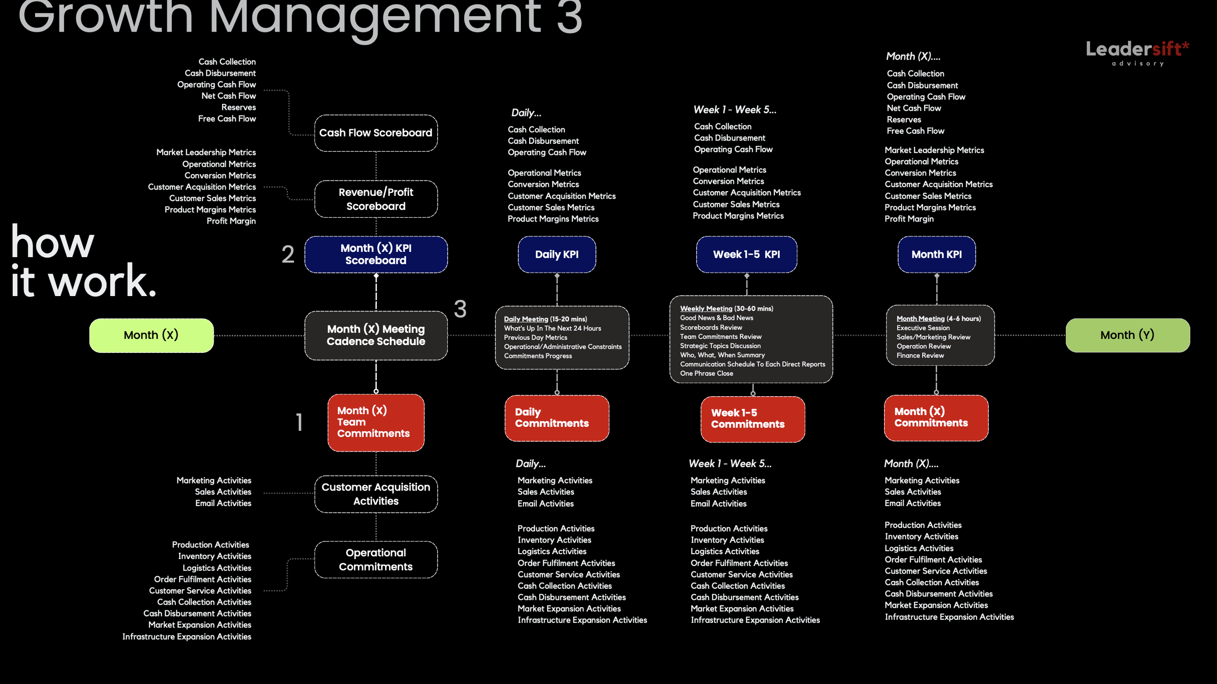 We build a team management structure aligning team commitments with streamlined KPI performance scoreboard and daily/weekly/monthly meeting cadence — clarifying growth driving commitments, aligning teams focus, improving decisions, and ensuring consistent execution to growth objectives of revenue, costs efficiencies, profit, and cash flow maximisations.