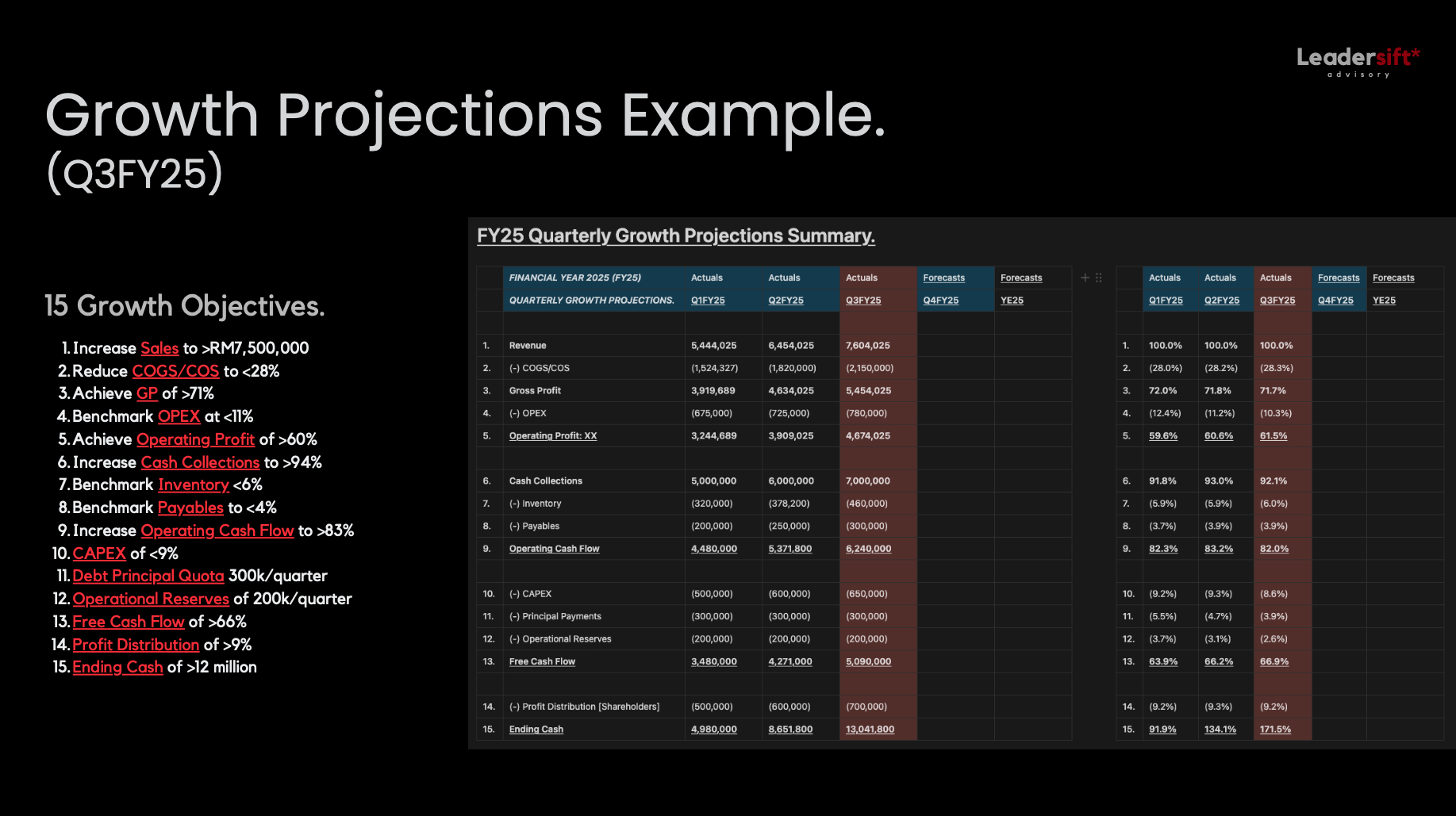 → Profit & Cash Flow Growth Projections with operational/financial breakdowns on how to achieve them instead of just vague financial goals or growth plans.